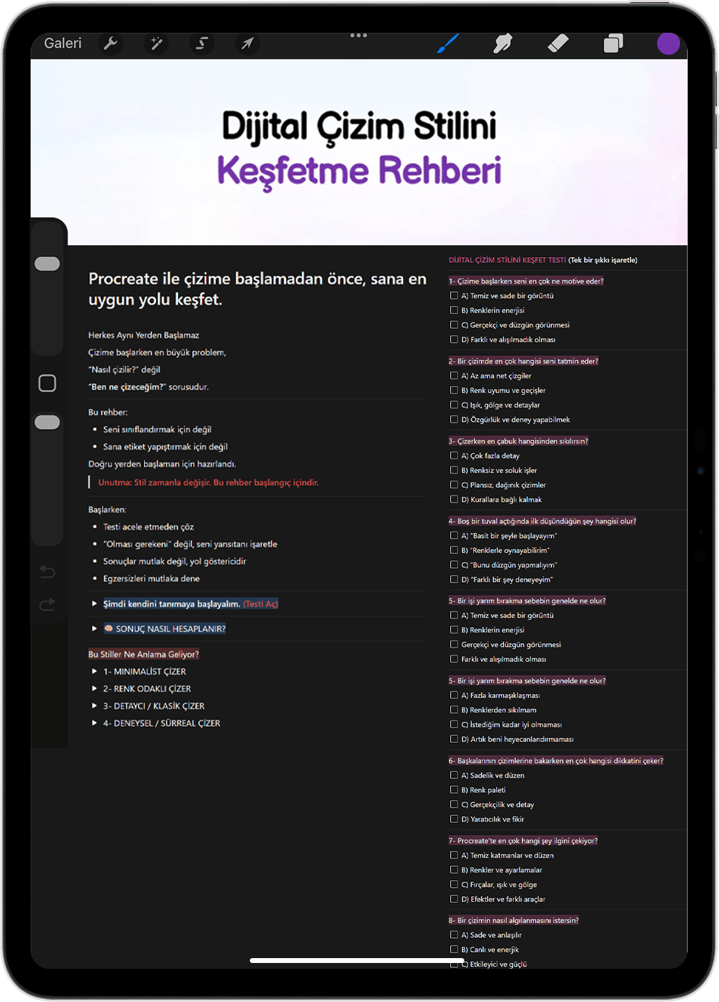Şöyle ki bu eğitim seti 2 kısımdan oluşuyor dersek, ilk kısımda Procreate'in nasıl kullanıldığını öğreniyorsunuz. Ve malesef ki Procreate sadece Apple tabletlerde kullanılan bir program.